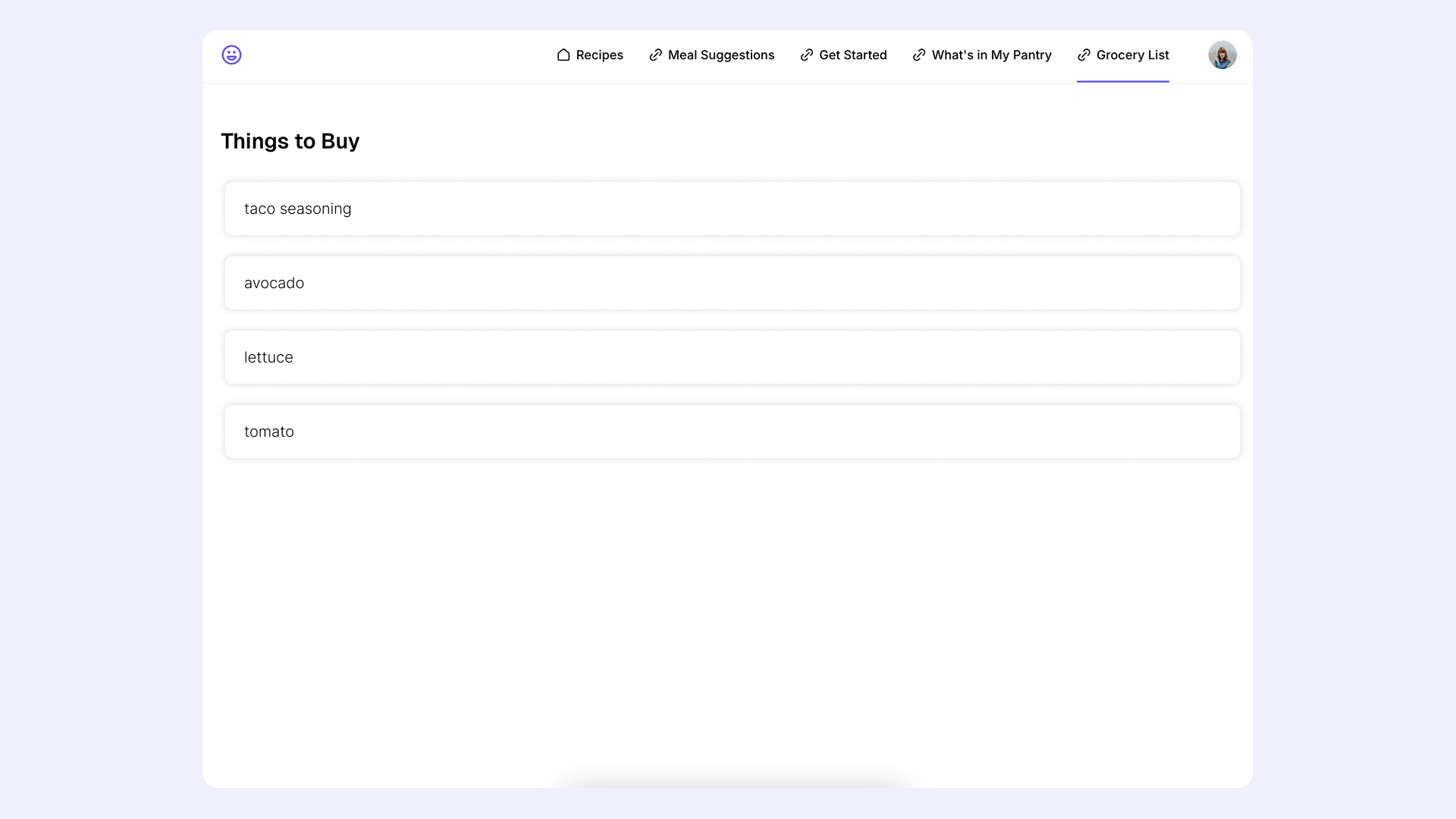 Step 4: By combining pantry inventory with selected recipes, Smartbite instantly generates a streamlined shopping list, making meal prep and grocery runs faster and smarter.