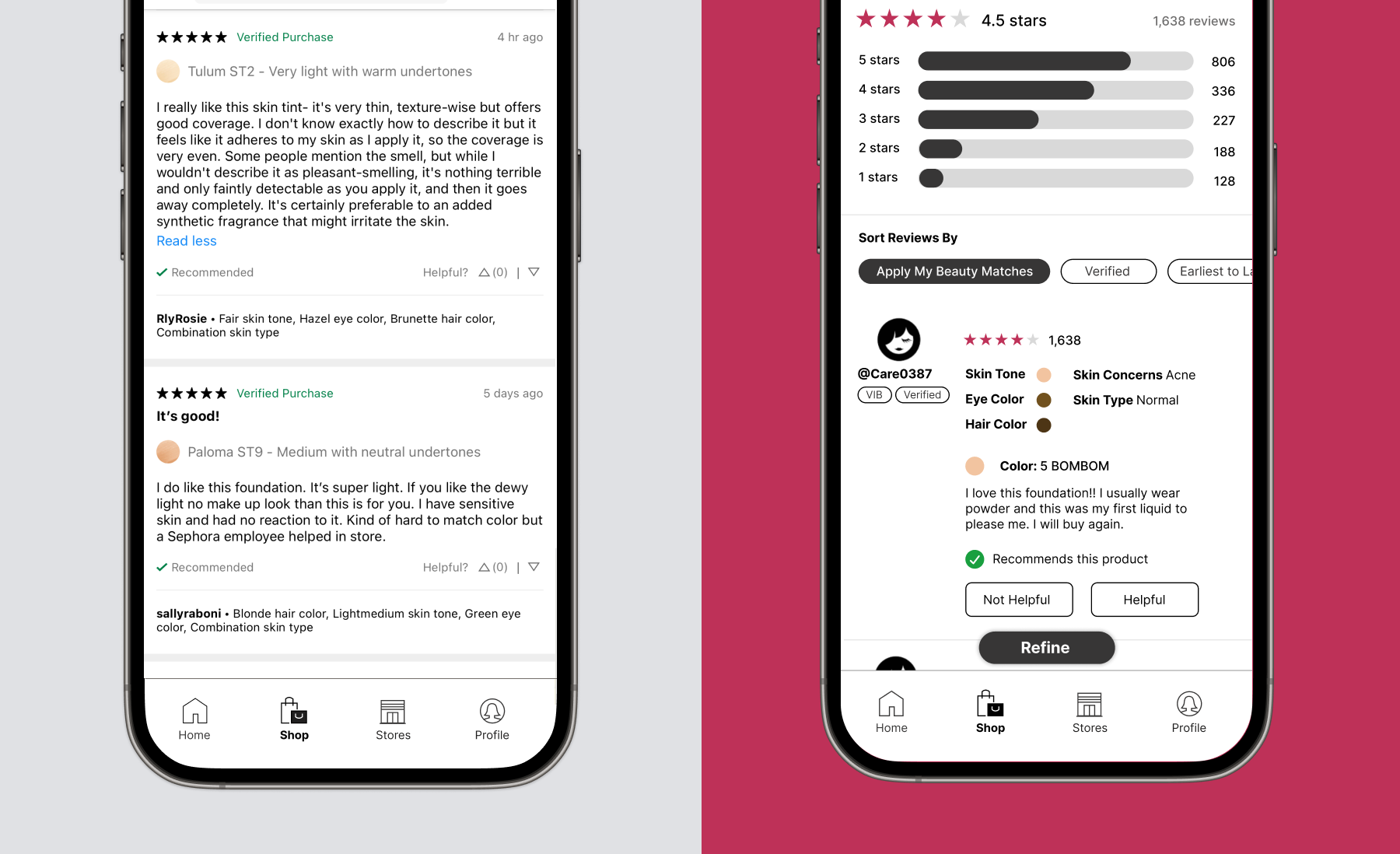 User testing with eight participants surfaced key improvements for Version 1, while also highlighting positives like the intuitive color carousel, clean checkout process, and visible Sephora VIB program.
